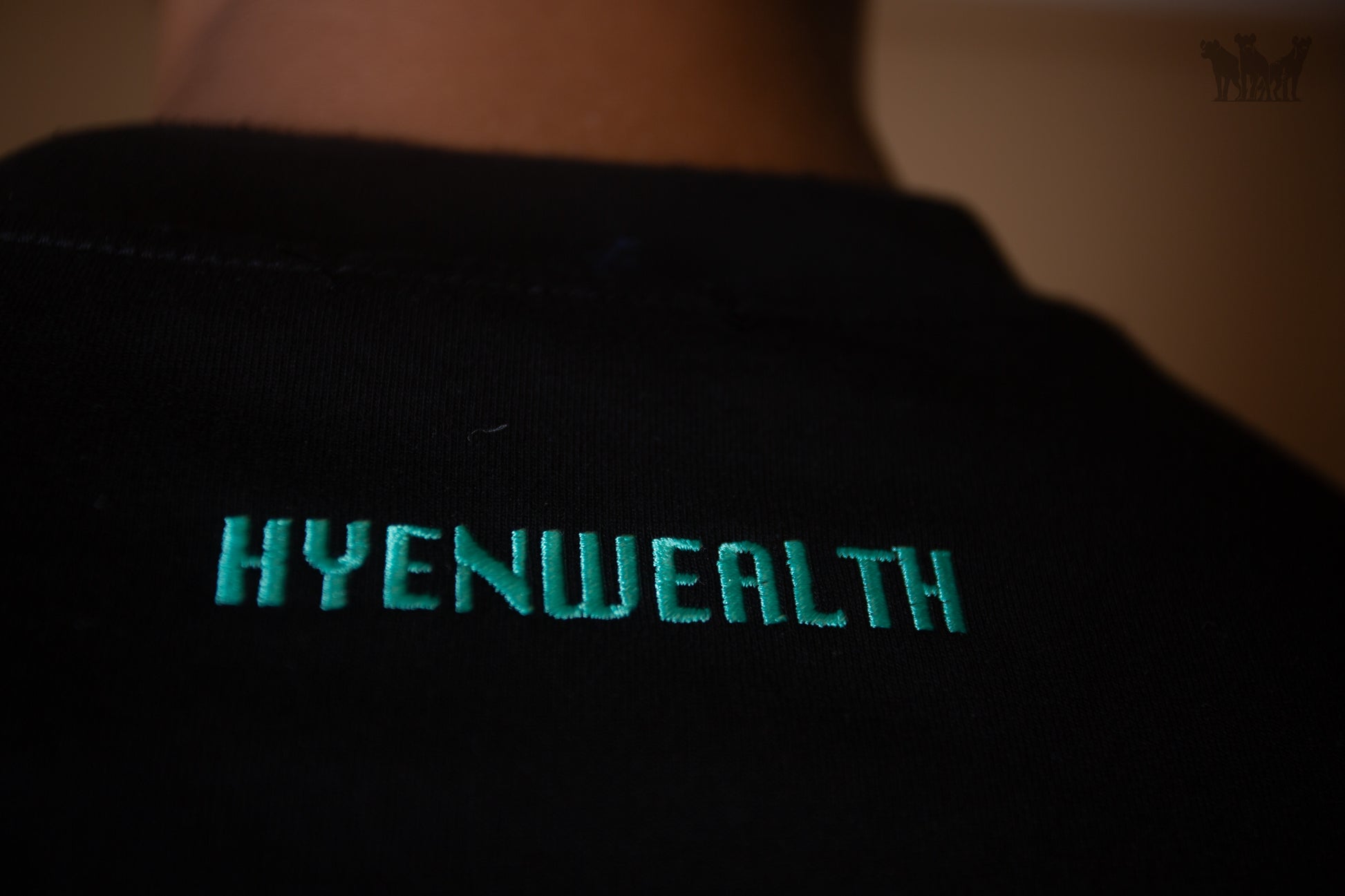 - Broderie inscription "HYENWEALTH" au niveau de la nuque
